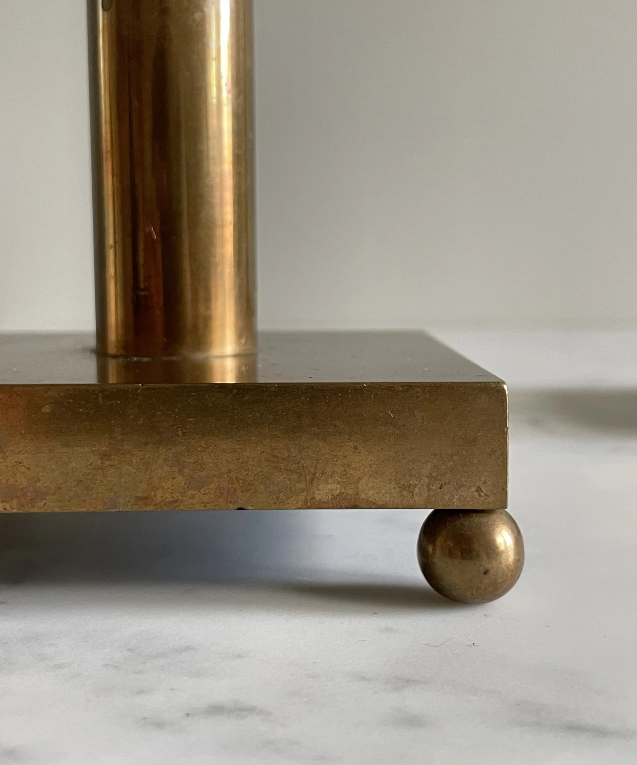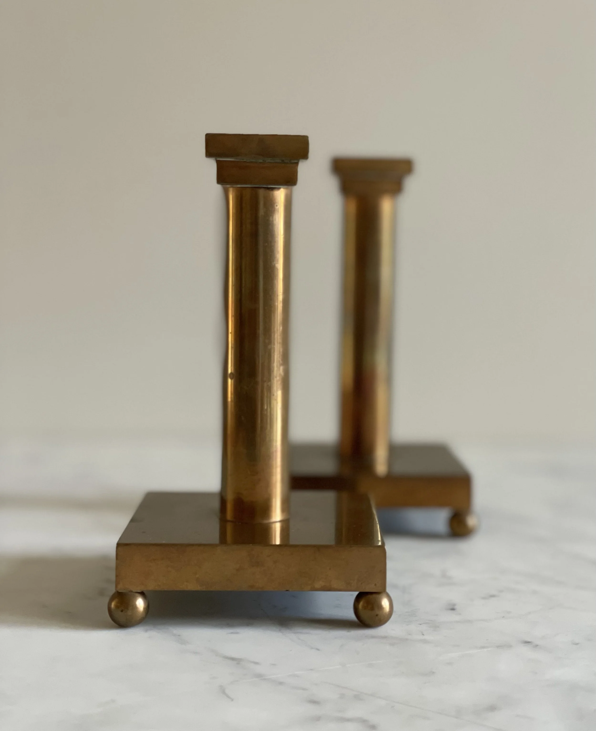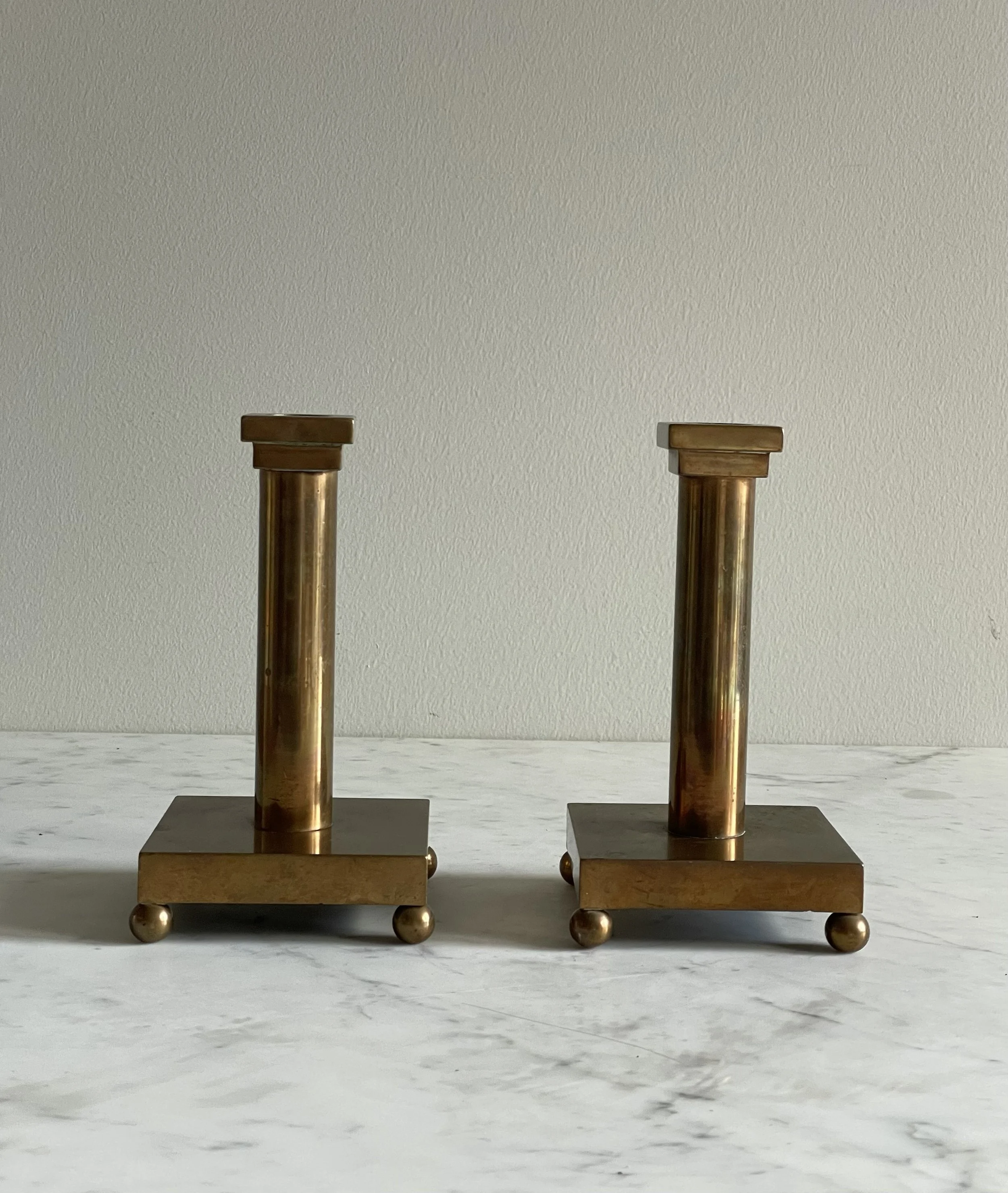 A pair of Candle holders in brassGreat vintage condition with signs of use.Width: 9 cm, lengths: 9 cm, height: 16,5 cm.2500 SEK / Purchase this item