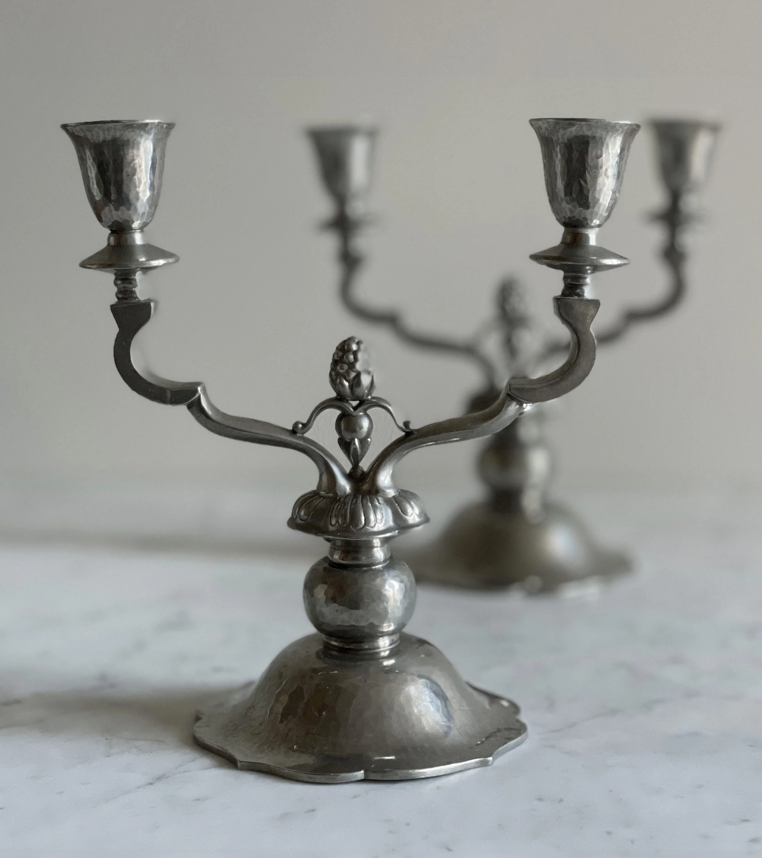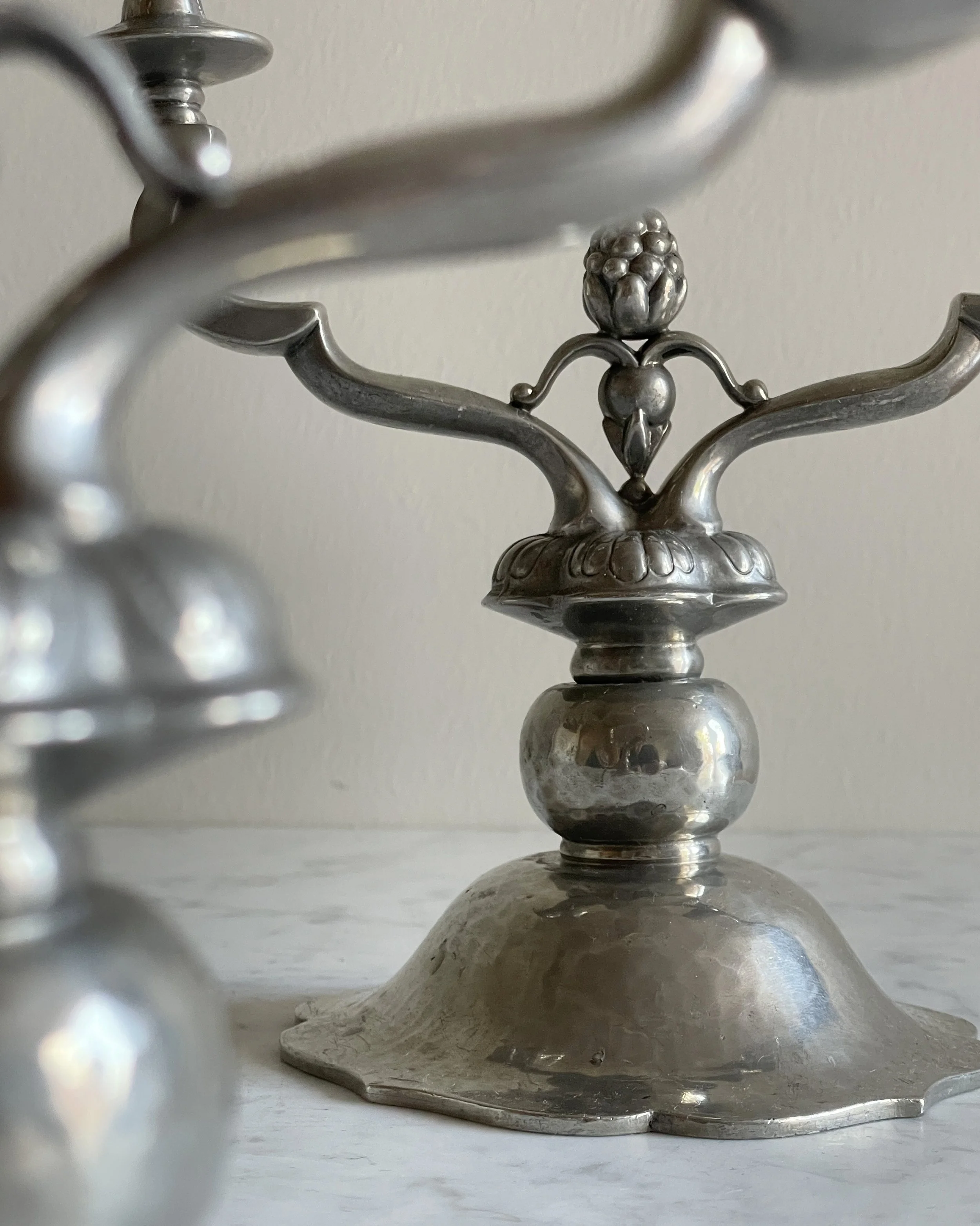 Just Andersen (1884-1943) Danish sculptor and silversmith, started his own workshop in 1918. He is best known for his objects in pewter, brass, bronze and so-called disco metal, an alloy consisting of lead, tin and antimony. Disco was Just Andersen's own invention, (named after Disko Bay in Greenland where he grew up). During the mid-1920s and early 1930s Just Andersen made commissions for Nordiska Kompaniet and Guldsmedsaktiebolaget in Stockholm. Just Andersen is probably the most widely known designer of modern pewter in Denmark. He had his own showrooms in Berlin, London, New York and Los Angeles. In 1934 he designed cutlery for Firma Georg Jensen. Great vintage condition with signs of use.