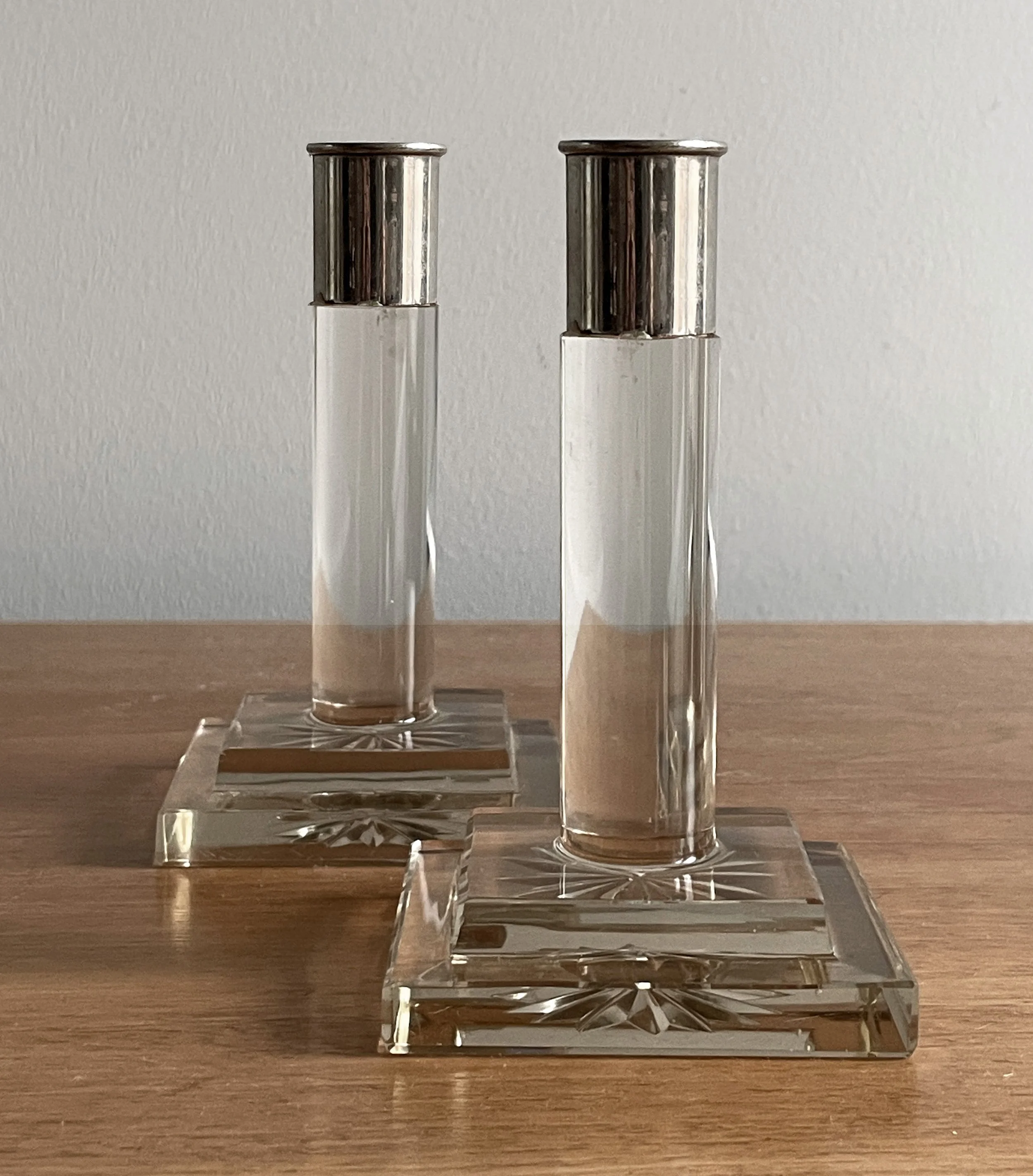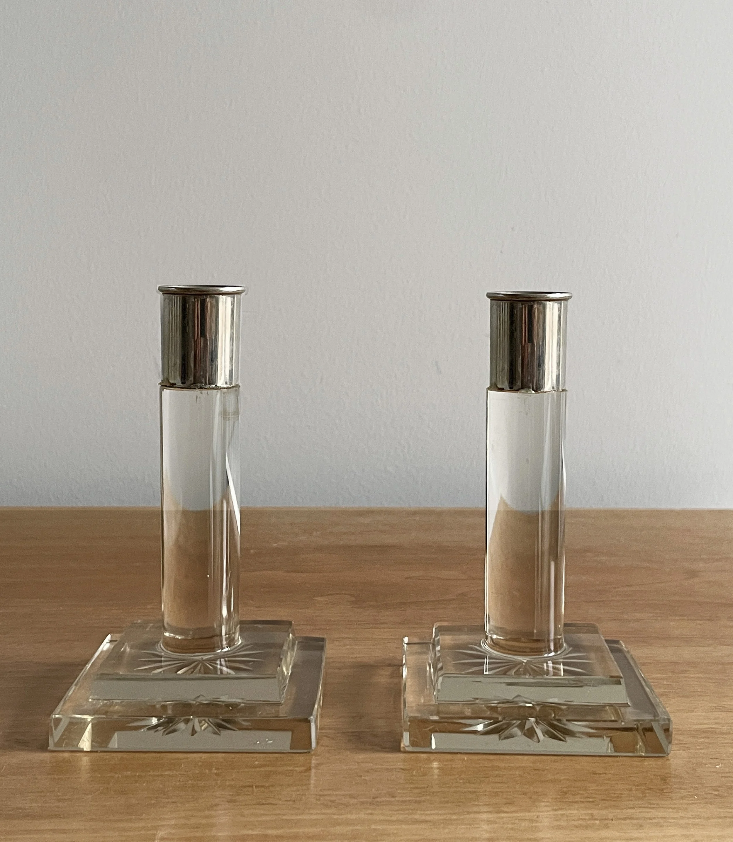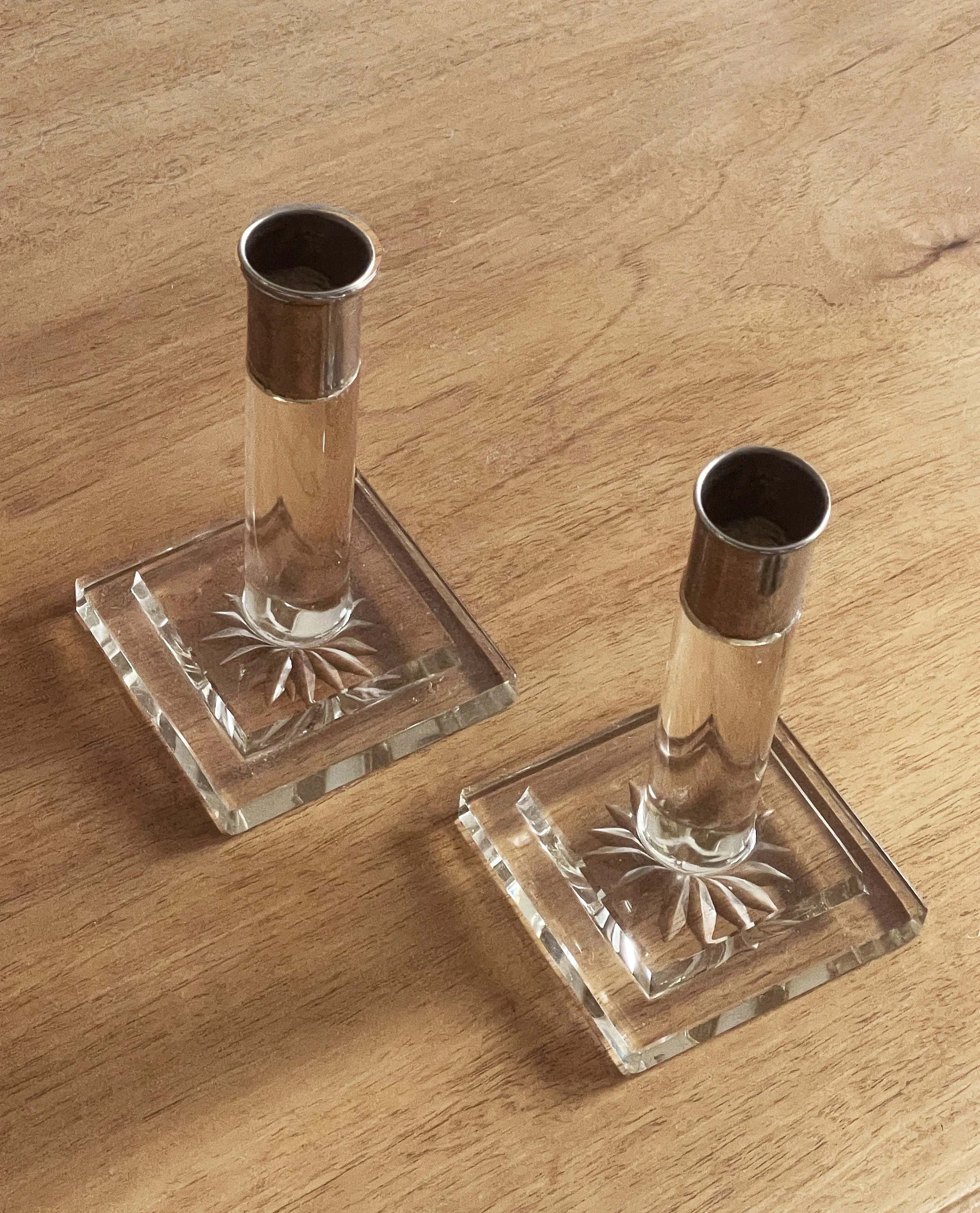 Vintage Candle holders in glass and silverGreat vintage condition with signs of use.Length: 7,5 cm, width: 7,5 cm, height: 13,5 cm.1600 SEK / Purchase this item
