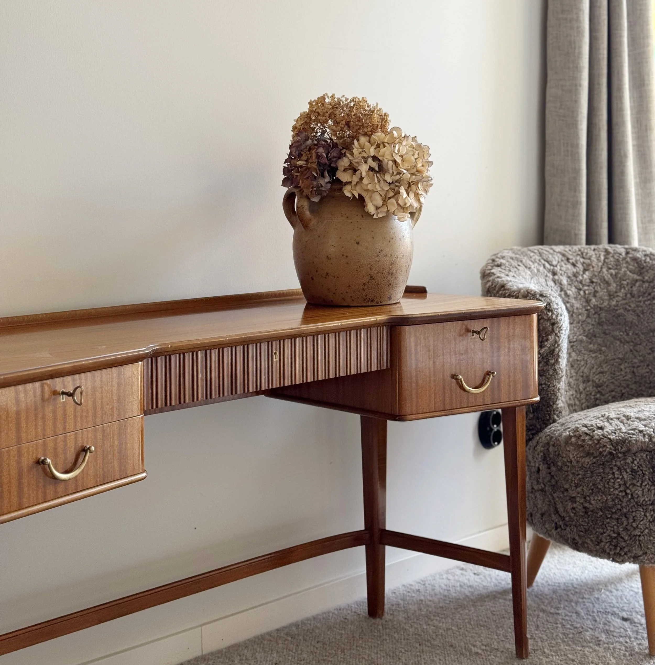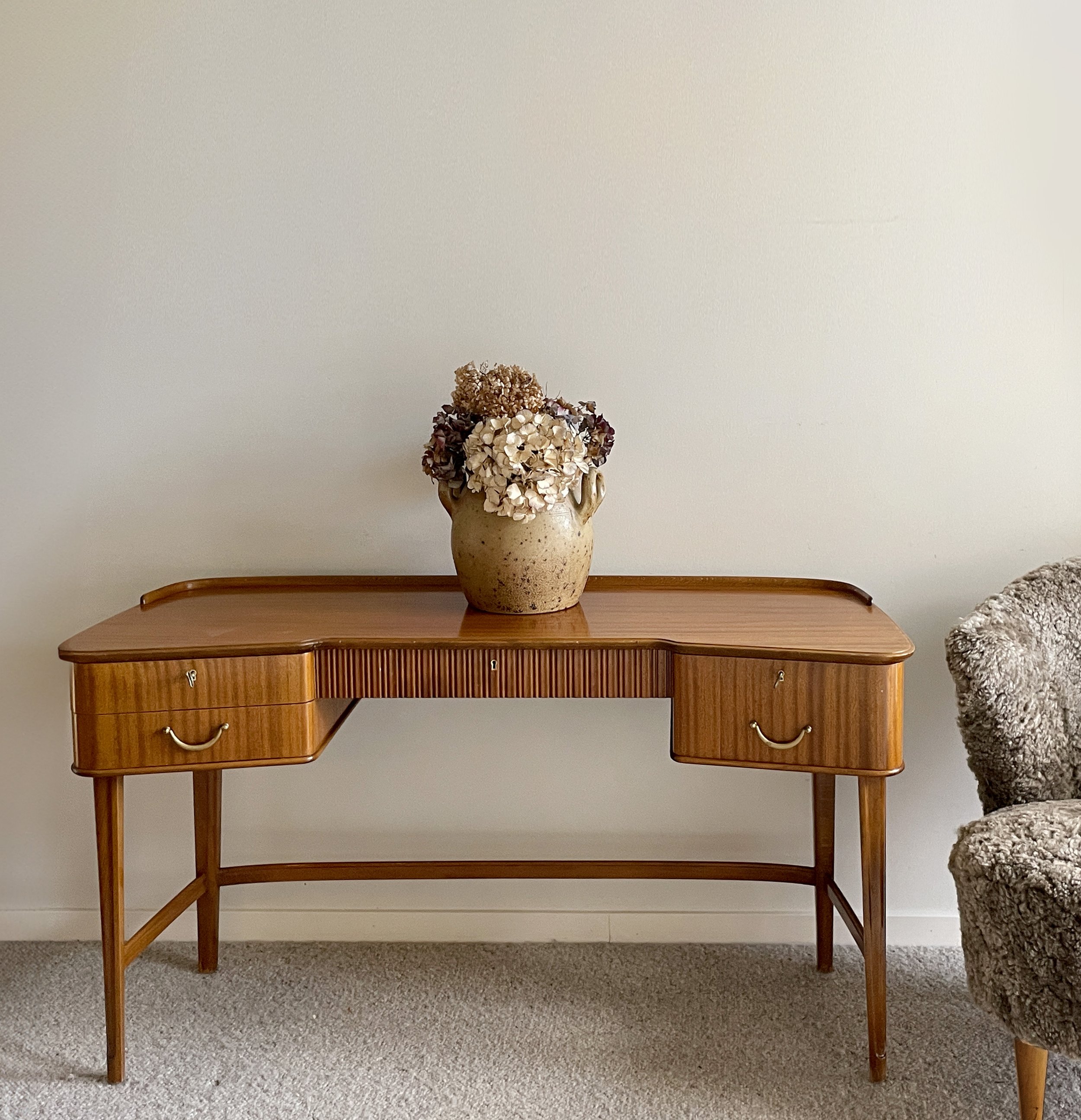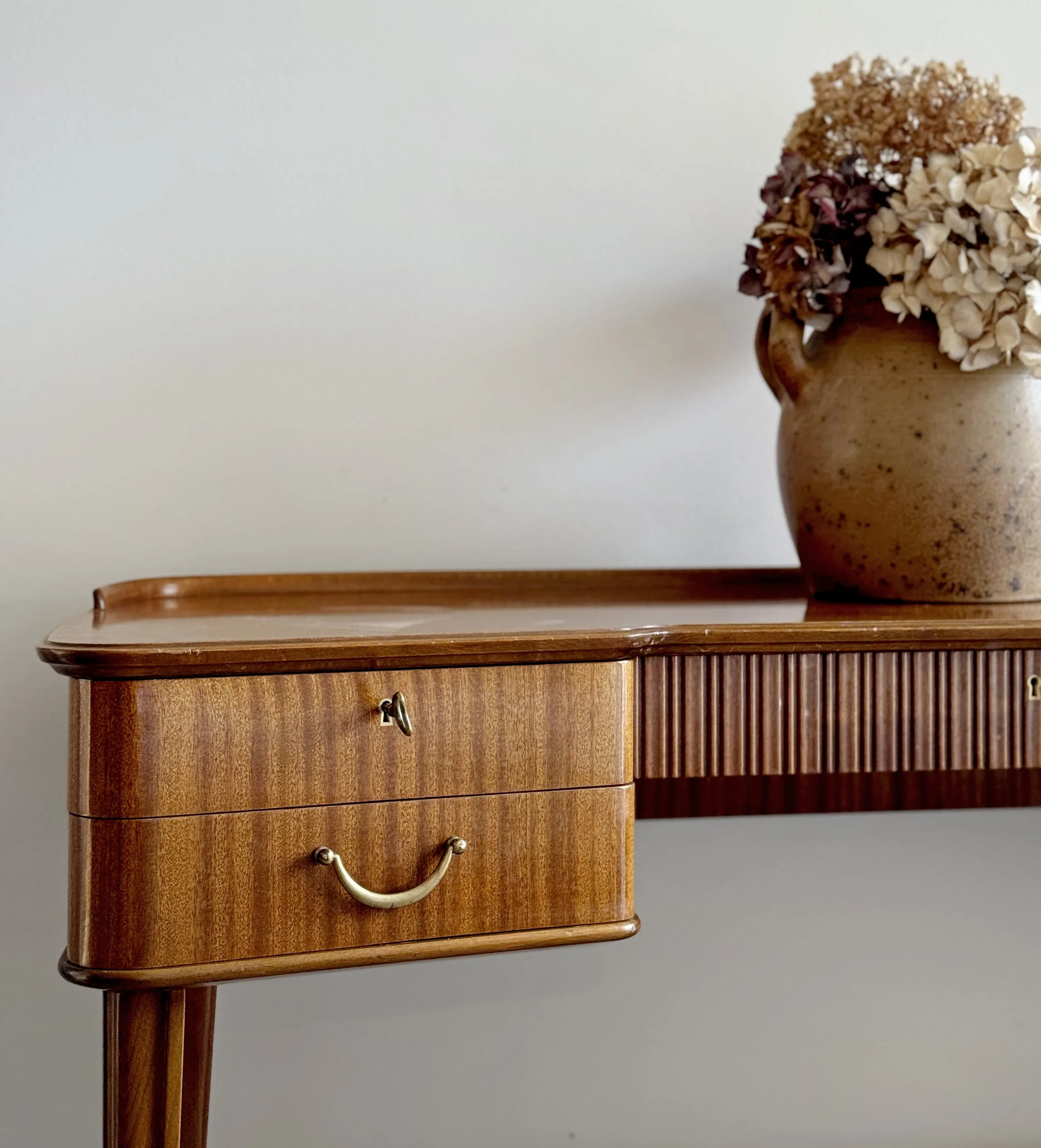 This desk radiates both charm and craftsmanship. The ribbed center detail, softly curved legs, and brass-toned handles give it an elegant character that fits just as beautifully in a bedroom as a vanity table, as it does in a hallway. Great vintage condition with signs of use.