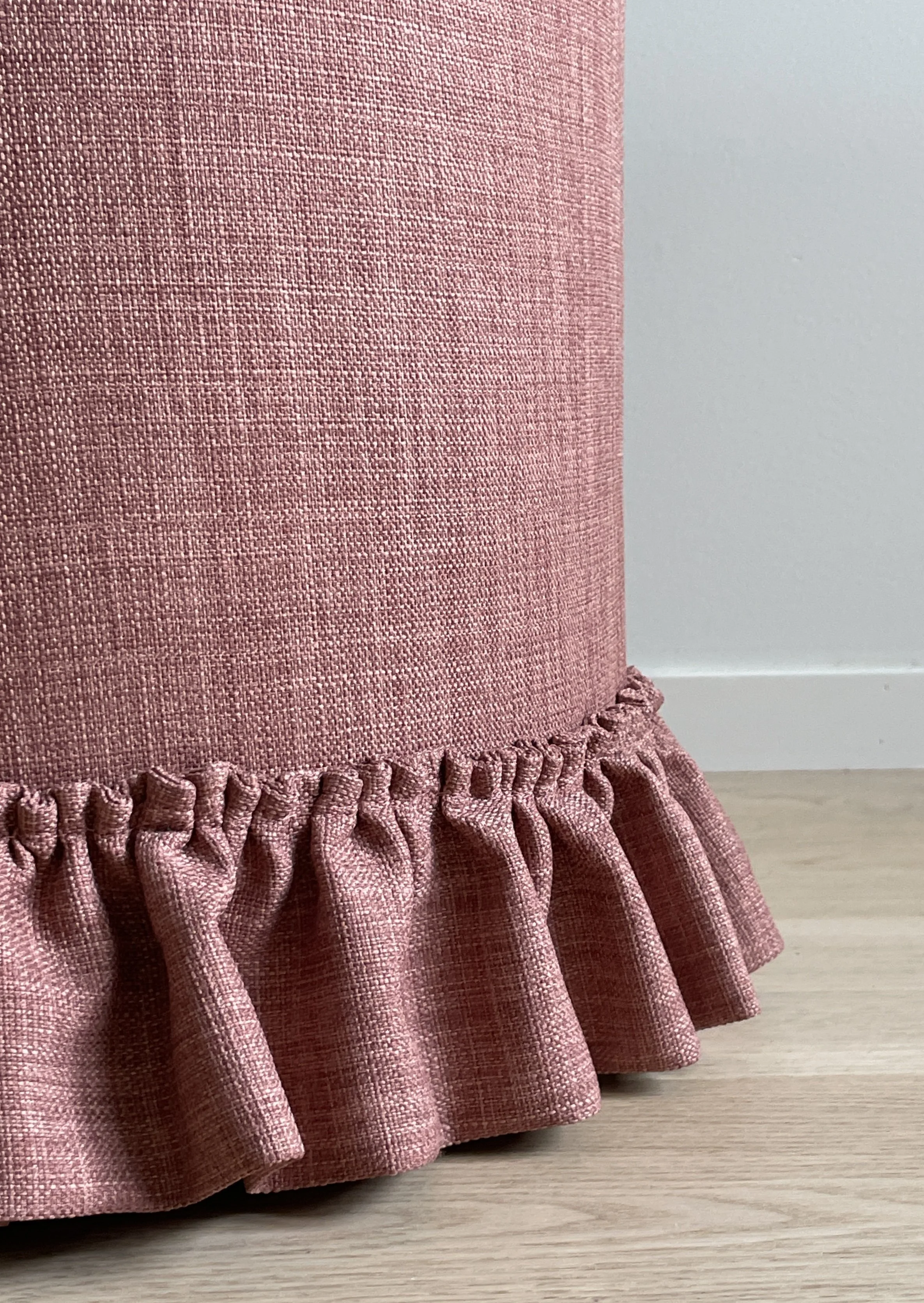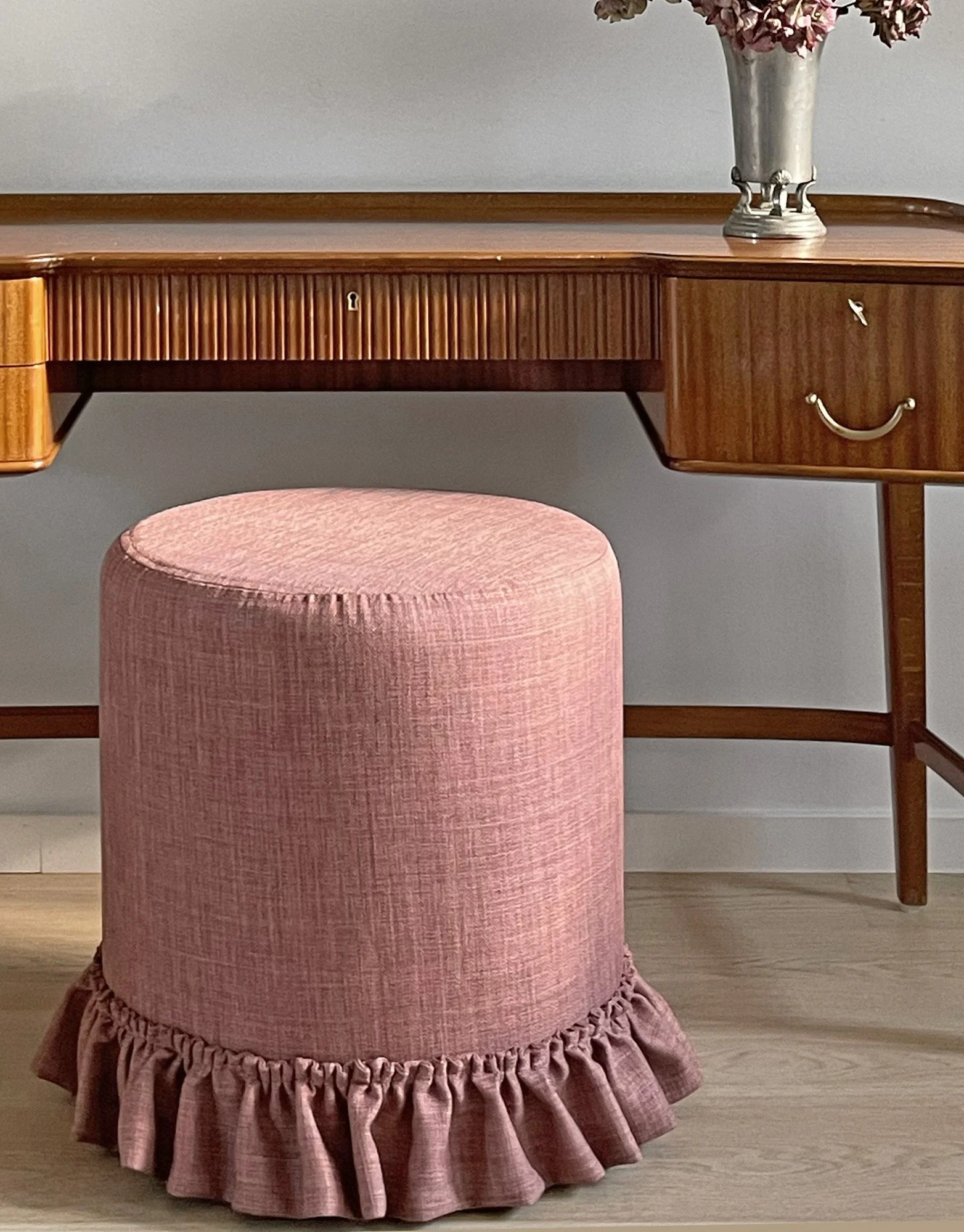 Charming round pouf in a durable linen fabric, finished with a ruffled skirt along the bottom edge. Custom-designed by Lindeberg/Ljung, made to order and available in different colors.