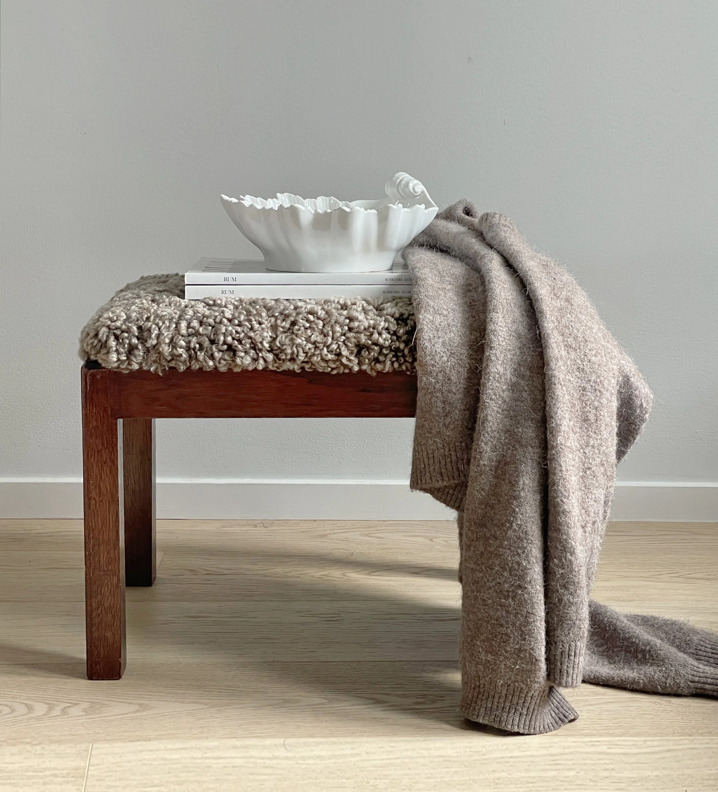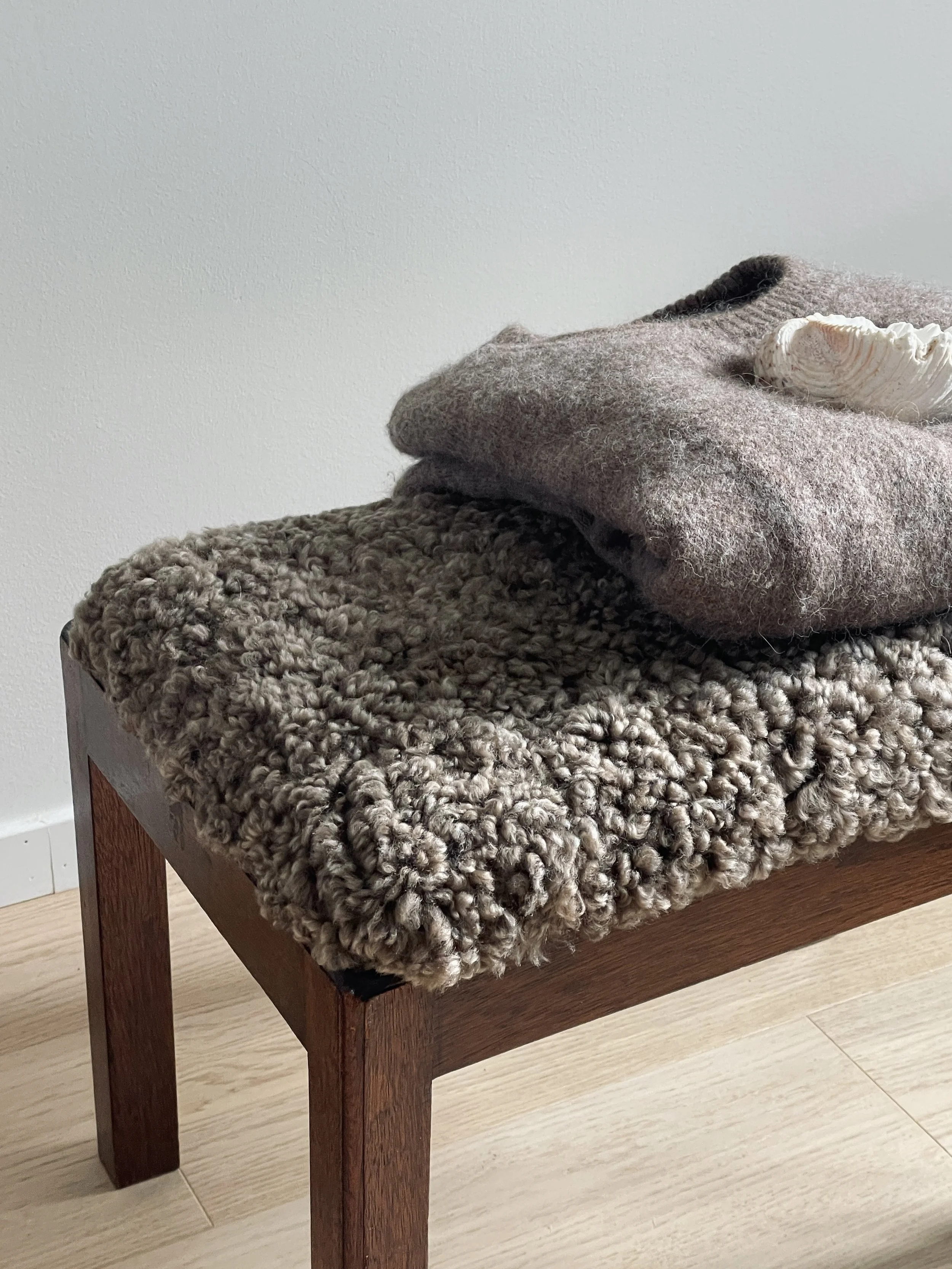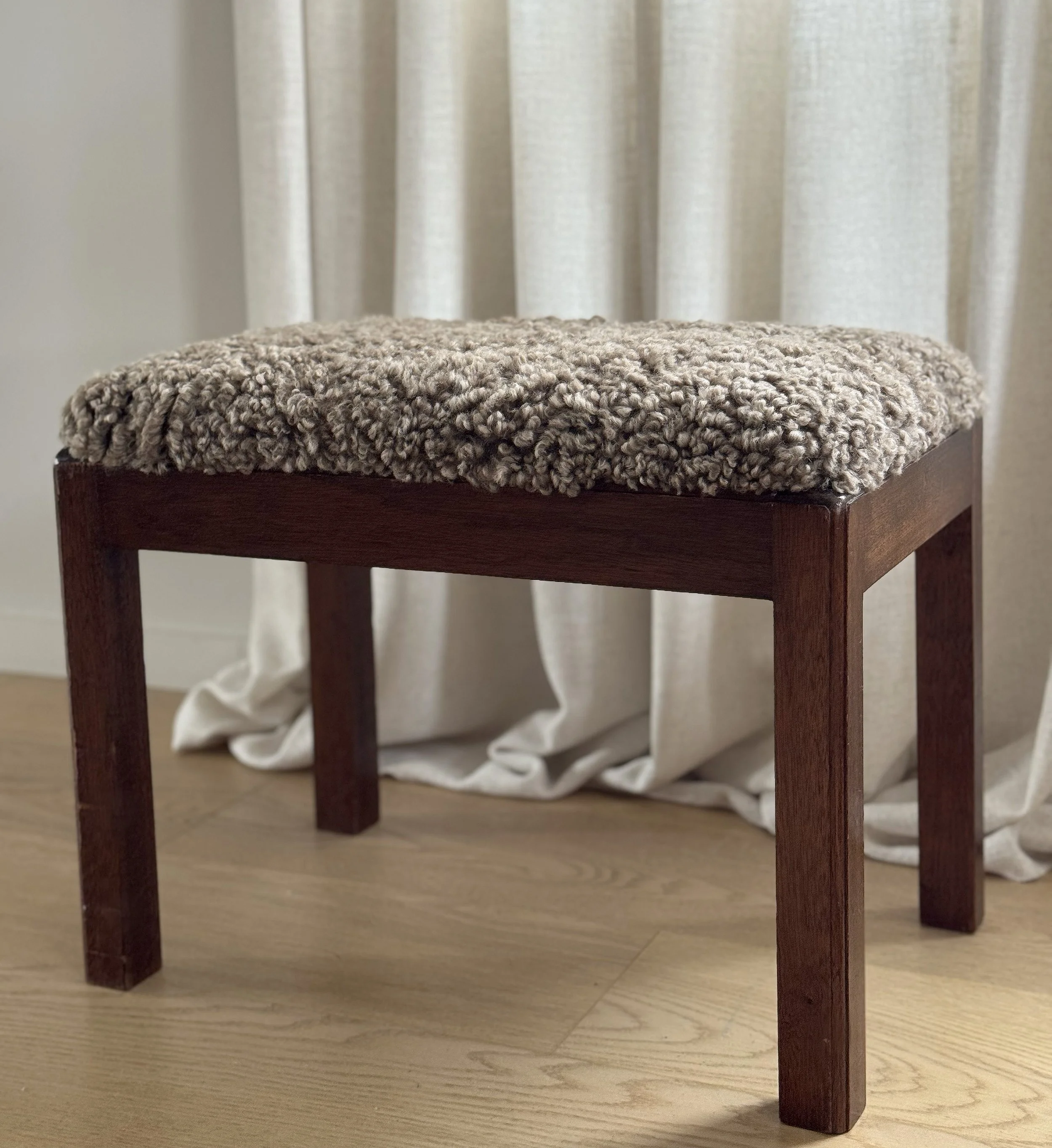 Pretty stool in dark oak upholstered in organic sheepskin. Great vintage condition with signs of use.