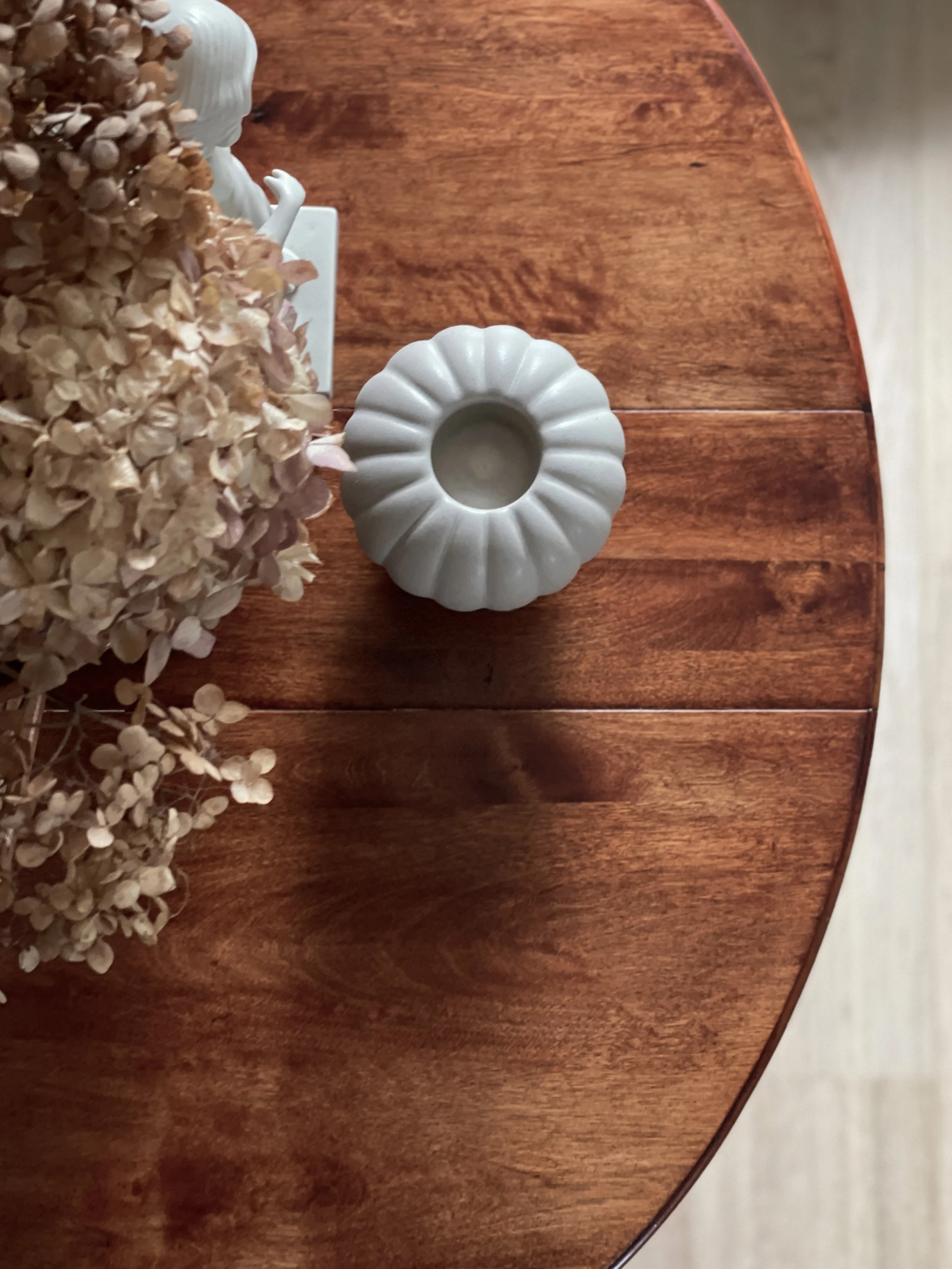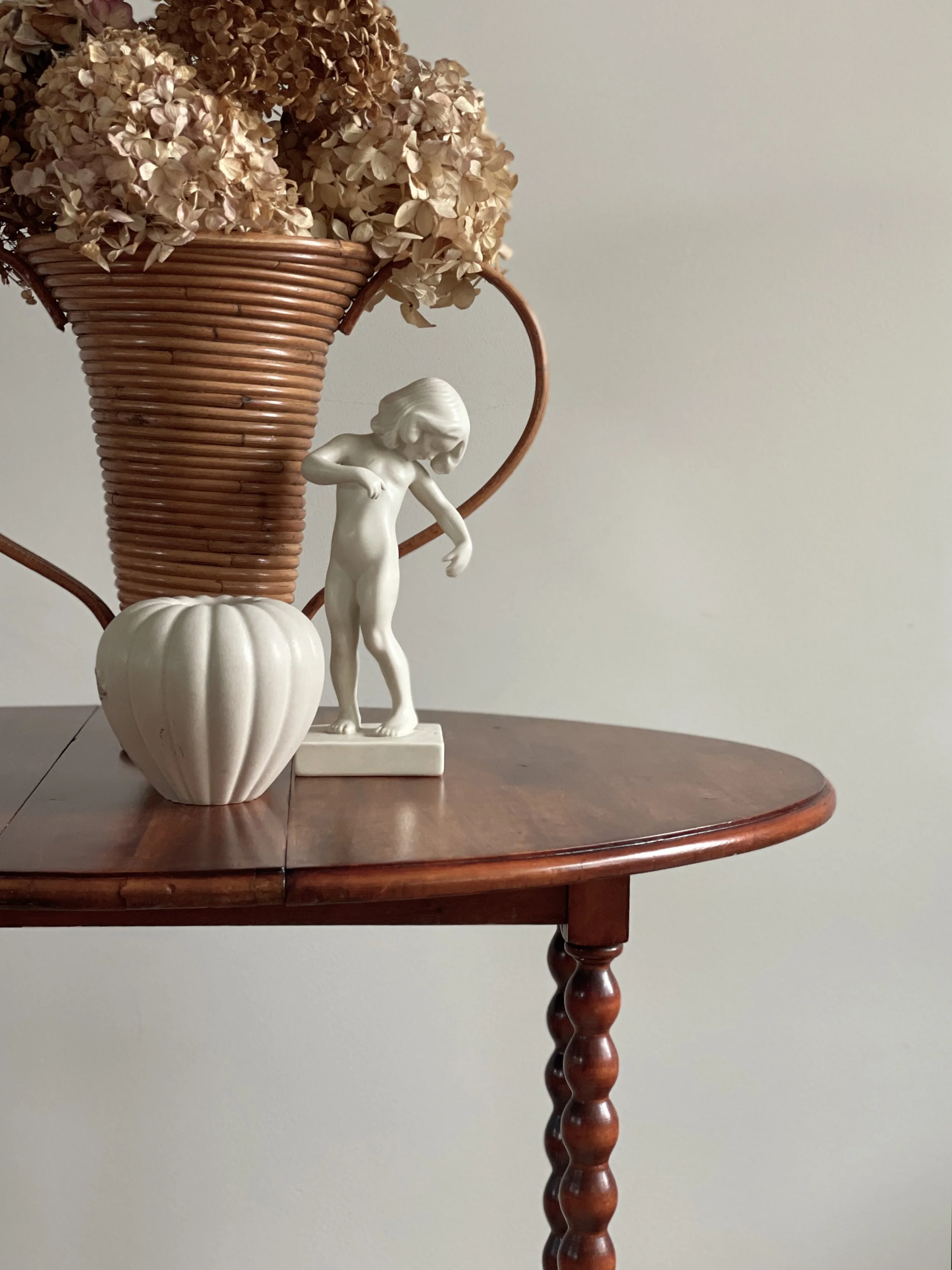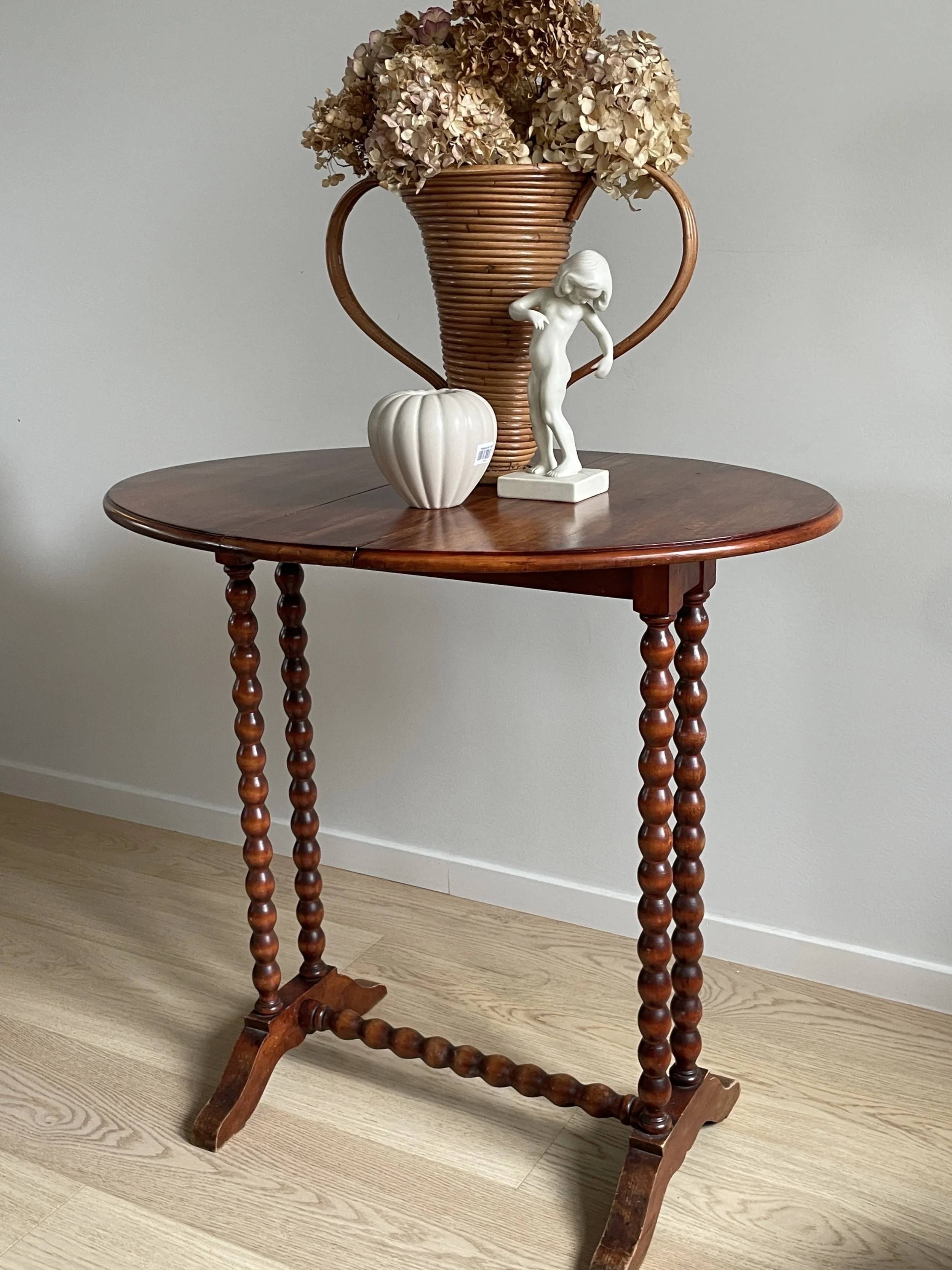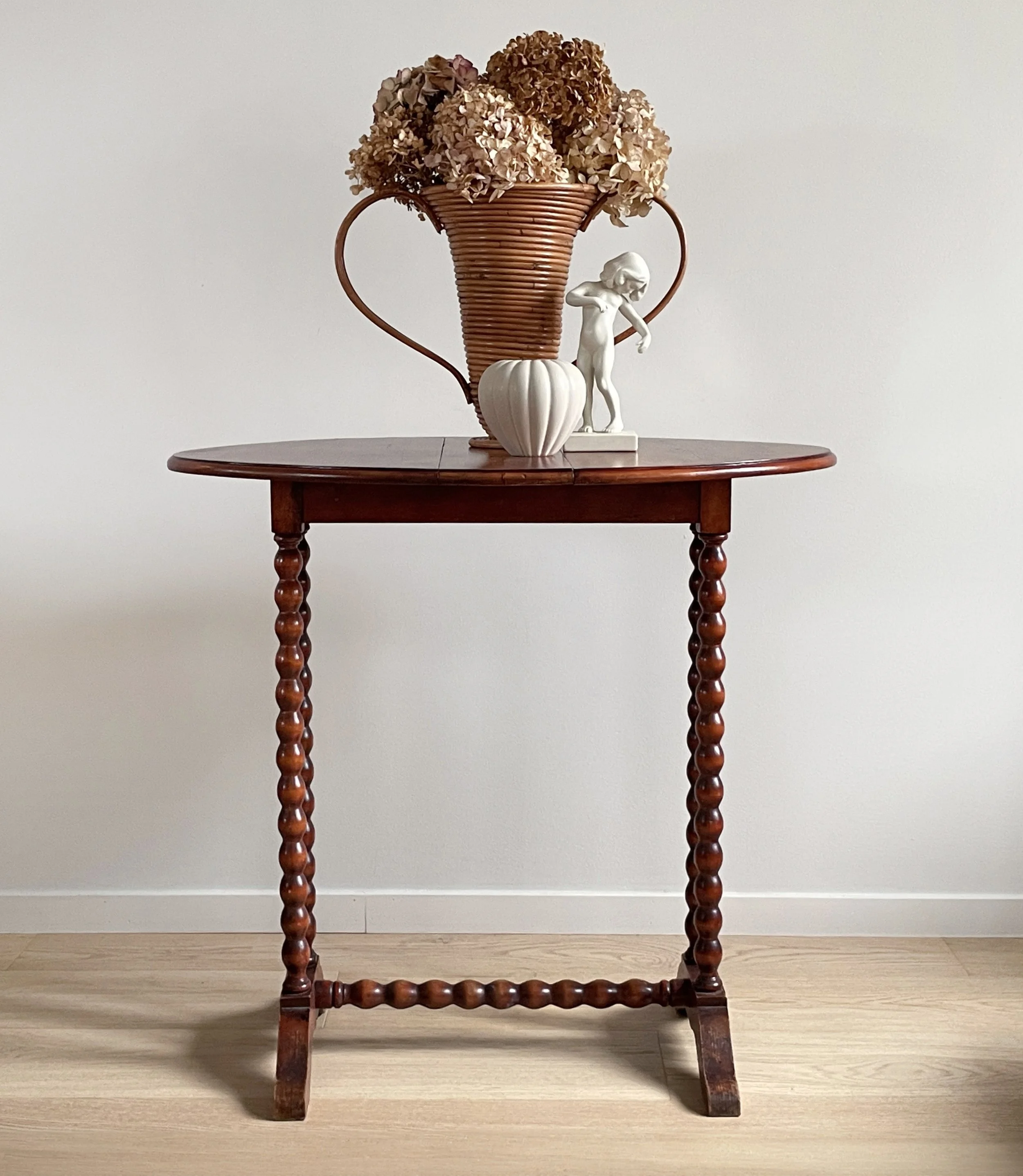 A beautiful vintage table featuring a round top and distinctive turned legs. The rich, dark wood tone gives it a timeless appeal, making it easy to blend with both modern and traditional interiors. Perfect as a side table in the living room, a small café table in the kitchen, or a decorative piece in the hallway. Great vintage condition with signs of use.