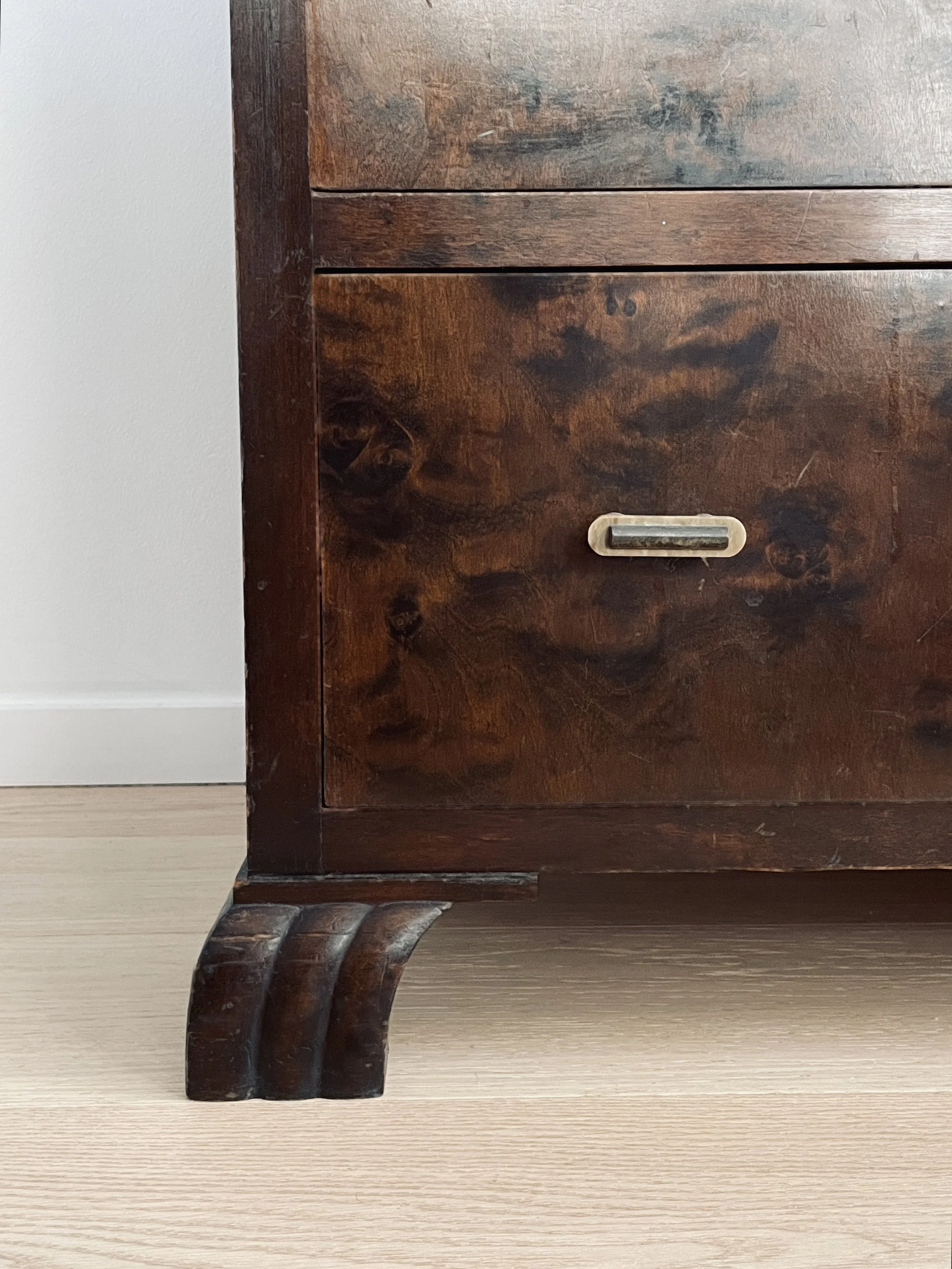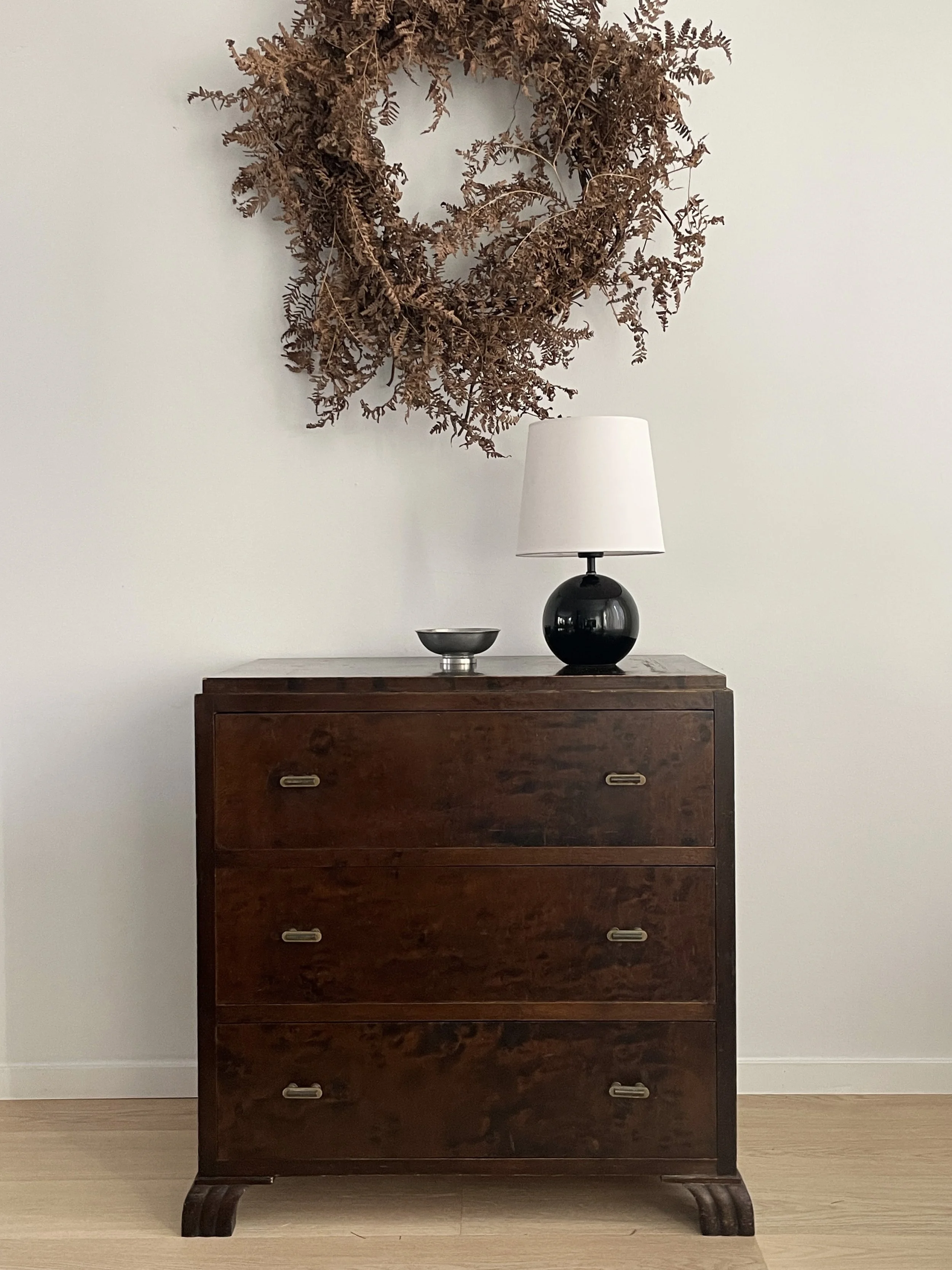 A chest of drawers, 1930's. Veneered with stained birch. Three drawers with brass details. Great vintage condition with signs of use.