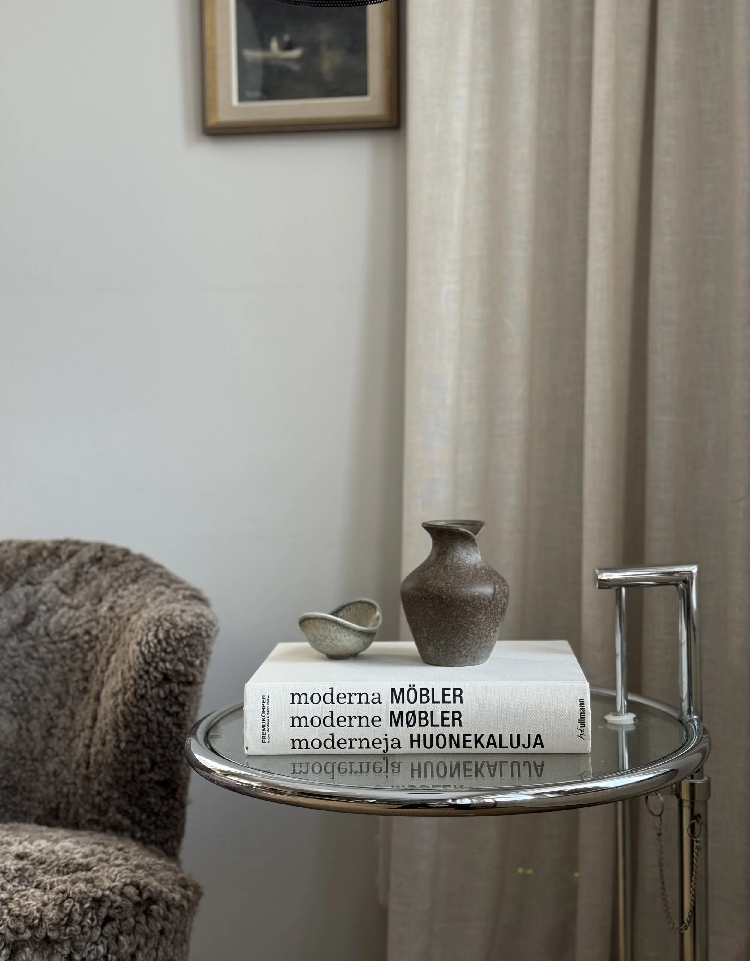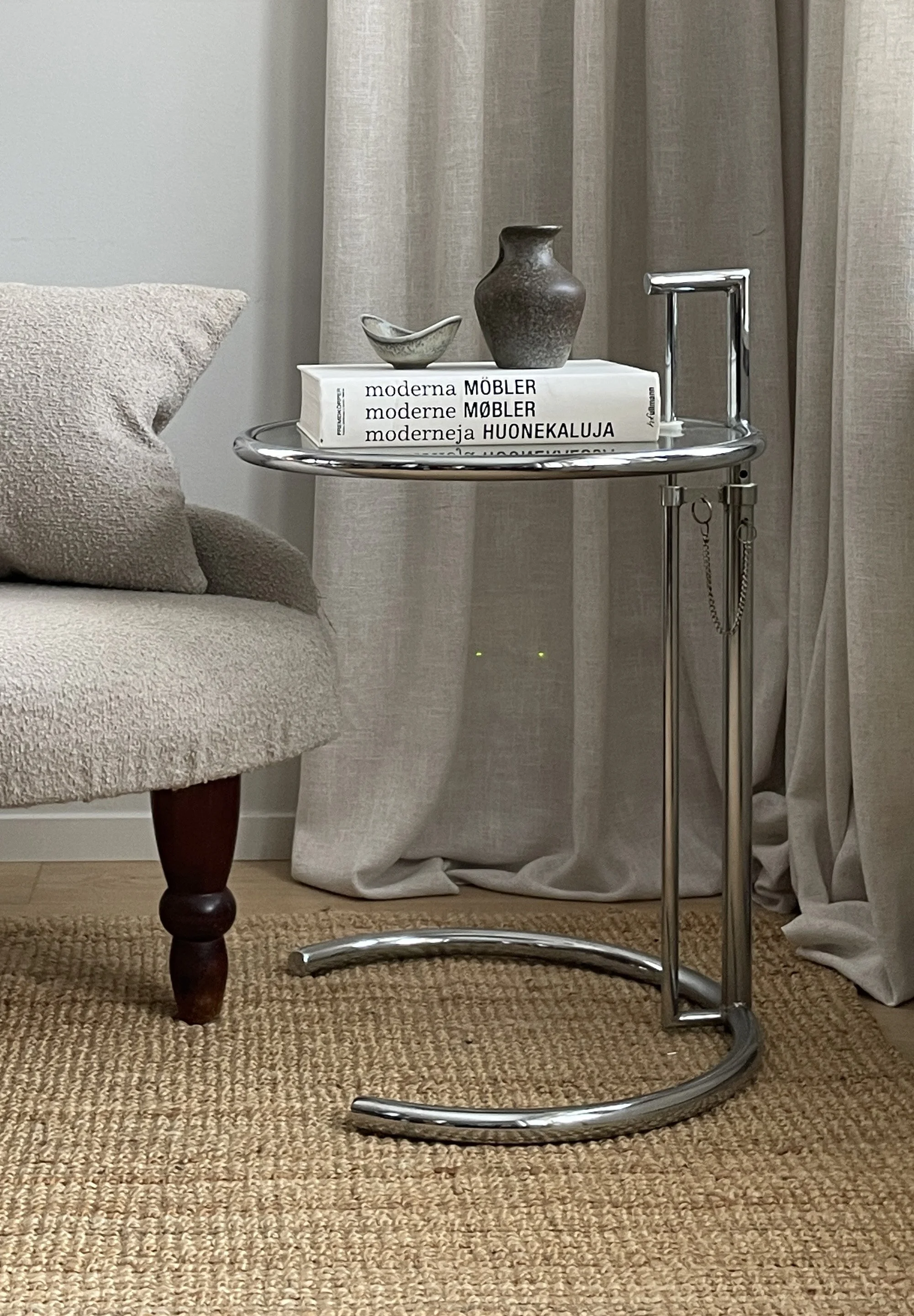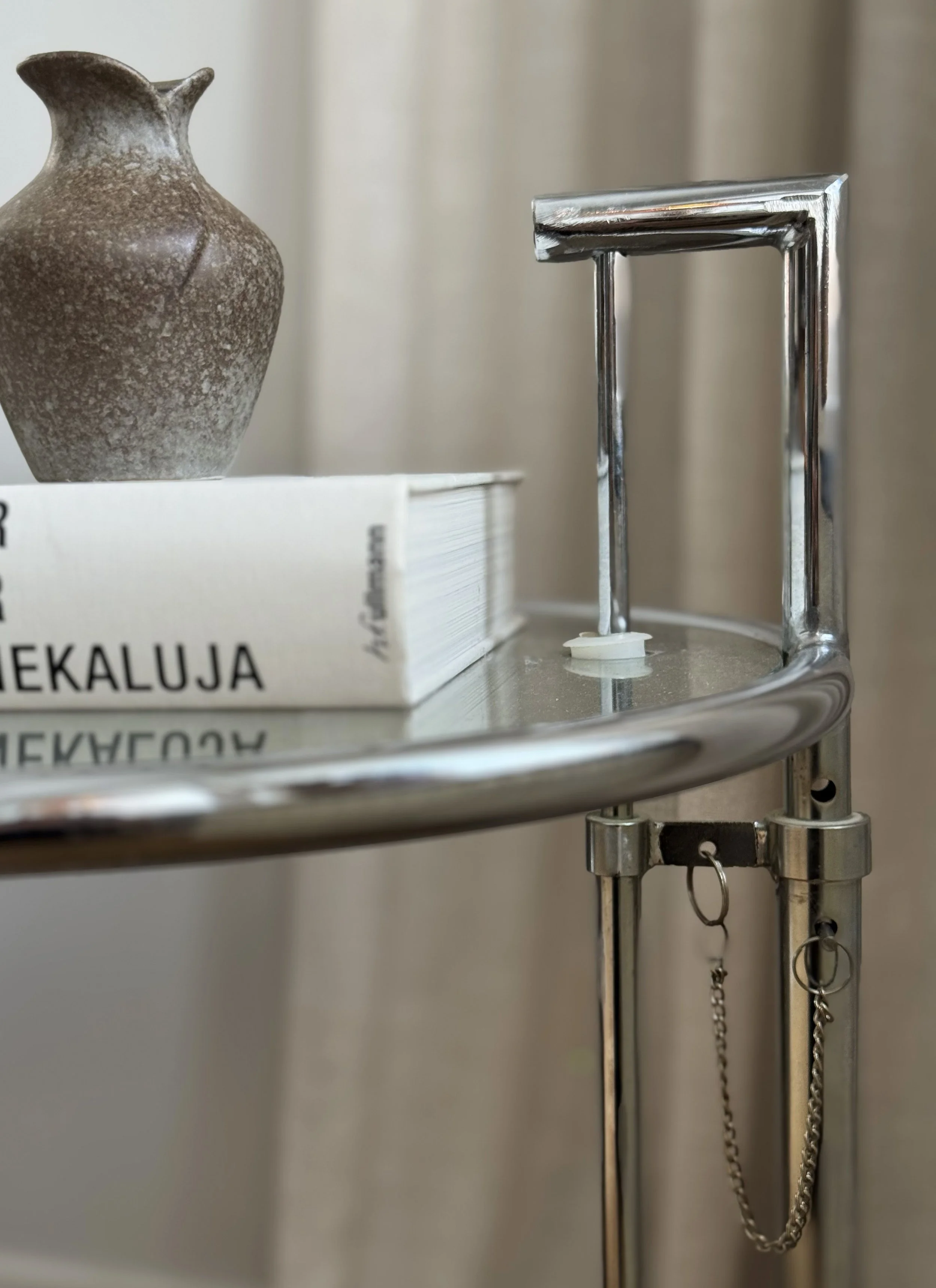 A true design icon. This elegant side table is a late 20th-century licensed edition of Eileen Gray’s iconic E1027 table, produced by Aram Designs. With its height-adjustable construction, chrome-plated steel frame, and clear glass top, it perfectly balances function and modernist elegance—just as Gray originally intended. Timeless in form, the piece works equally well beside a sofa, as a sculptural accent table, or as a refined bedside companion. Ideal for collectors of modern design or anyone looking to add a museum-worthy statement piece to their interior. Great vintage condition with signs of use.